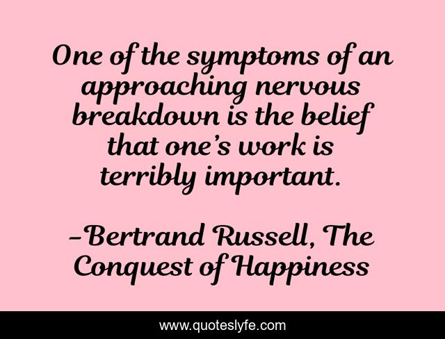 This page presents the quote "One of the symptoms of an approaching nervous breakdown is the belief that one’s work is terribly important.". Author of this quote is Bertrand Russell, The Conquest of Happiness. This quote is about importance, work, neurosis, self-perception, delusions, nervous-breakdowns, perspective,.
