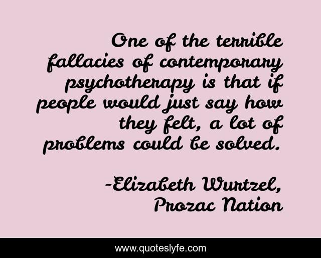 This page presents the quote "One of the terrible fallacies of contemporary psychotherapy is that if people would just say how they felt, a lot of problems could be solved.". Author of this quote is Elizabeth Wurtzel, Prozac Nation. .