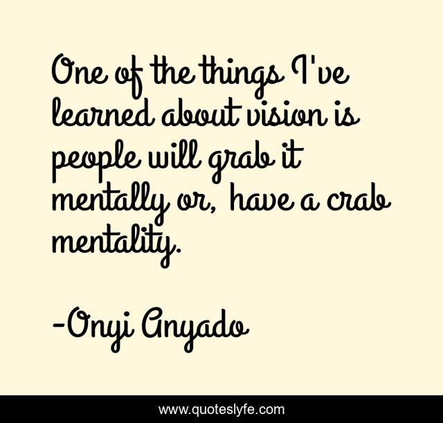 This page presents the quote "One of the things I've learned about vision is people will grab it mentally or, have a crab mentality.". Author of this quote is Onyi Anyado. This quote is about business-advice, inspire, business, leadership-development, entrepreneurship, quote-of-the-day-mindset, leadership, brainyquote, quotes-to-live-by,.