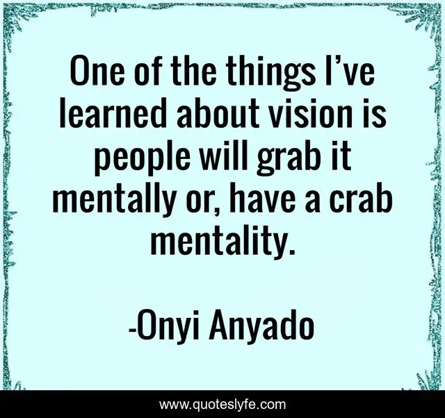 This page presents the quote "One of the things I’ve learned about vision is people will grab it mentally or, have a crab mentality.". Author of this quote is Onyi Anyado. This quote is about brainy, mind, entrepreneurship, entrepreneur, leadership, onyi-anyado, crab-mentality, brainyquote, quotes-to-live-by,.