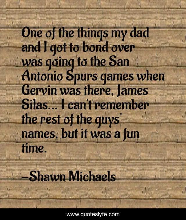This page presents the quote "One of the things my dad and I got to bond over was going to the San Antonio Spurs games when Gervin was there, James Silas... I can't remember the rest of the guys' names, but it was a fun time.". Author of this quote is Shawn Michaels. This quote is about fun, remember, time,.