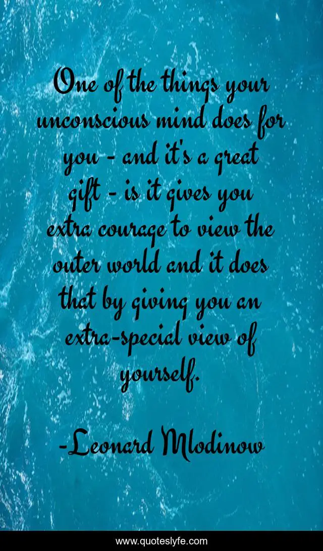 This page presents the quote "One of the things your unconscious mind does for you - and it's a great gift - is it gives you extra courage to view the outer world and it does that by giving you an extra-special view of yourself.". Author of this quote is Leonard Mlodinow. This quote is about world, great, mind,.
