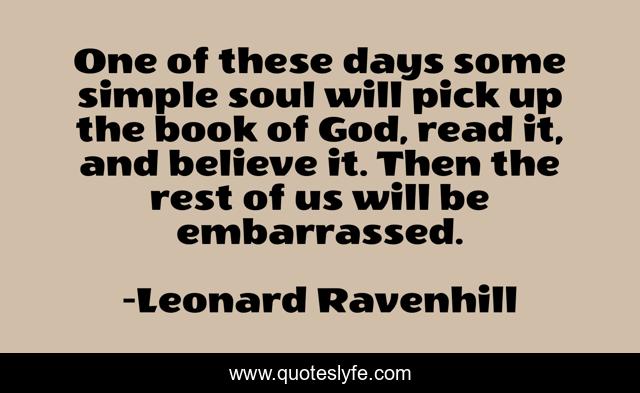 This page presents the quote "One of these days some simple soul will pick up the book of God, read it, and believe it. Then the rest of us will be embarrassed.". Author of this quote is Leonard Ravenhill. .