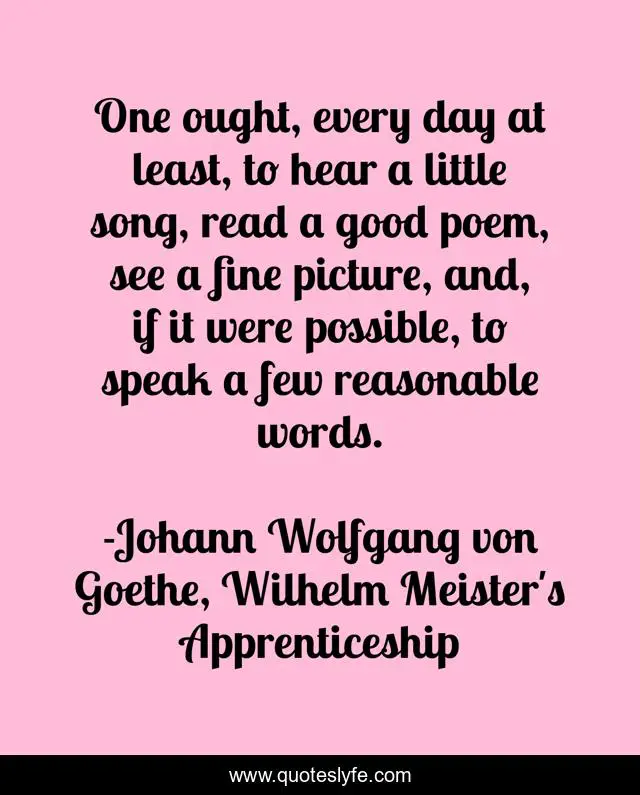 This page presents the quote "One ought, every day at least, to hear a little song, read a good poem, see a fine picture, and, if it were possible, to speak a few reasonable words.". Author of this quote is Johann Wolfgang von Goethe, Wilhelm Meister's Apprenticeship. This quote is about art, good-life, music, poetry, self-improvement,.
