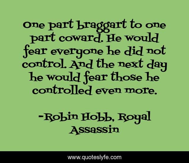 This page presents the quote "One part braggart to one part coward. He would fear everyone he did not control. And the next day he would fear those he controlled even more.". Author of this quote is Robin Hobb, Royal Assassin. This quote is about regal, politics,.