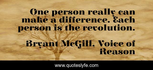 This page presents the quote "One person really can make a difference. Each person is the revolution.". Author of this quote is Bryant McGill, Voice of Reason. This quote is about making-a-difference, revolution, taking-action,.