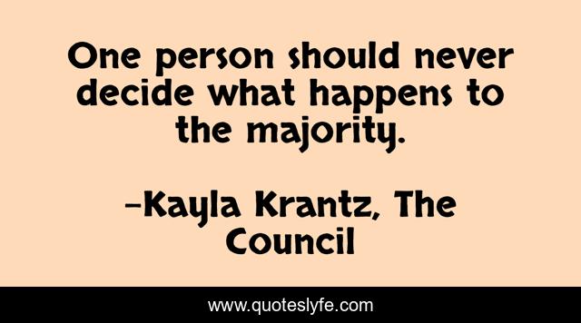 This page presents the quote "One person should never decide what happens to the majority.". Author of this quote is Kayla Krantz, The Council. This quote is about majority, decisions, people,.