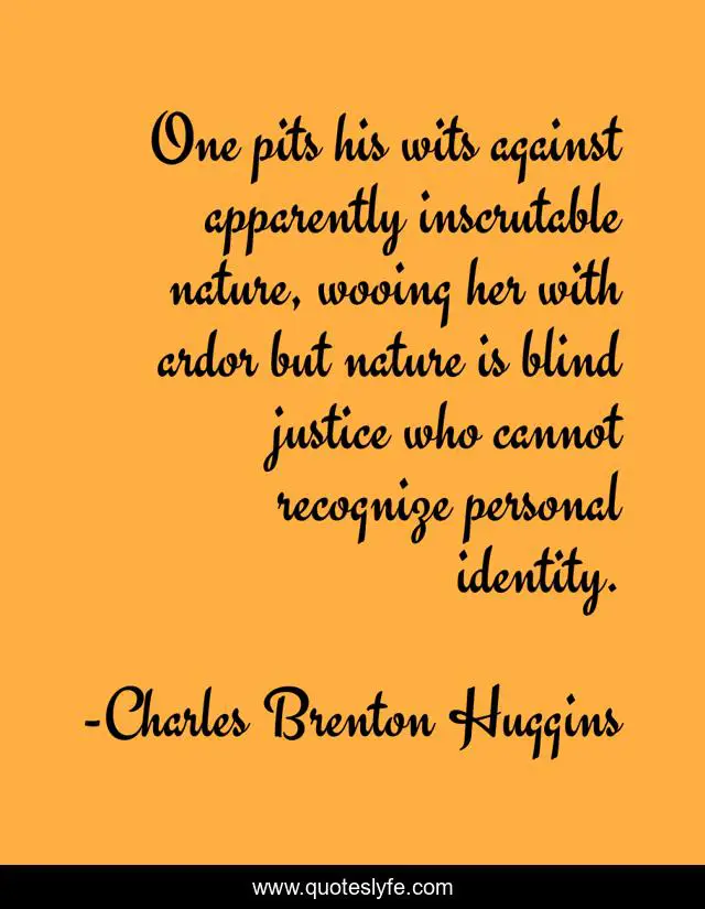This page presents the quote "One pits his wits against apparently inscrutable nature, wooing her with ardor but nature is blind justice who cannot recognize personal identity.". Author of this quote is Charles Brenton Huggins. This quote is about justice, blind, identity,.