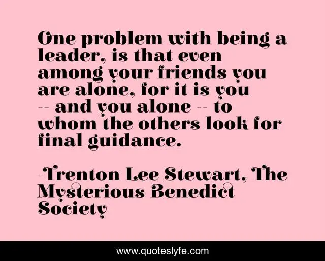 This page presents the quote "One problem with being a leader, is that even among your friends you are alone, for it is you -- and you alone -- to whom the others look for final guidance.". Author of this quote is Trenton Lee Stewart, The Mysterious Benedict Society. This quote is about leaders, friends, leader, the-mysterious-benedict-society,.