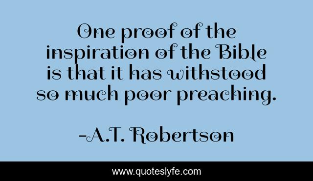 This page presents the quote "One proof of the inspiration of the Bible is that it has withstood so much poor preaching.". Author of this quote is A.T. Robertson. This quote is about a-t-robertson, bible, scripture,.