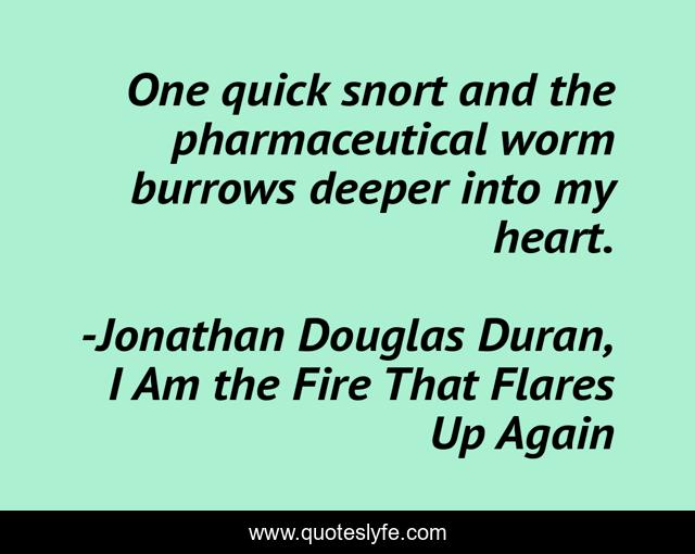 This page presents the quote "One quick snort and the pharmaceutical worm burrows deeper into my heart.". Author of this quote is Jonathan Douglas Duran, I Am the Fire That Flares Up Again. This quote is about drugs, hearts, worms,.
