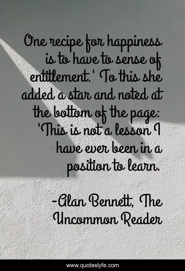 This page presents the quote "One recipe for happiness is to have to sense of entitlement.' To this she added a star and noted at the bottom of the page: 'This is not a lesson I have ever been in a position to learn.". Author of this quote is Alan Bennett, The Uncommon Reader. This quote is about expectations, happiness,.
