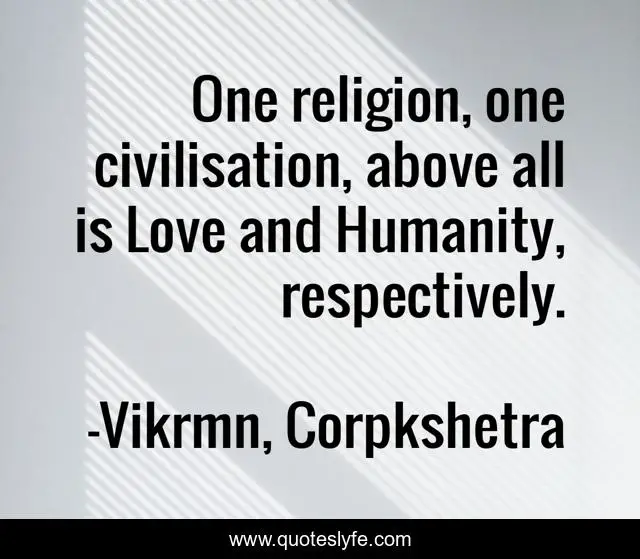 This page presents the quote "One religion, one civilisation, above all is Love and Humanity, respectively.". Author of this quote is Vikrmn, Corpkshetra. This quote is about corpkshetra, confidence, love, corporate, motivational, civilisation, ca-vikram-verma, chartered-accountant, religion,.