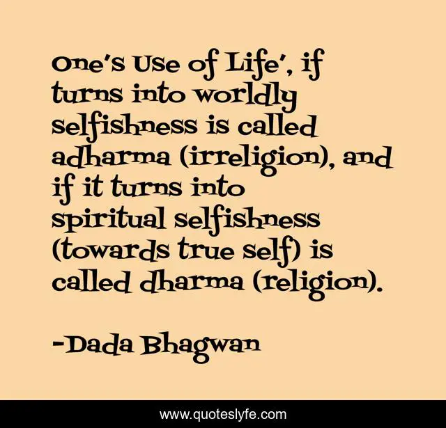 This page presents the quote "One’s Use of Life’, if turns into worldly selfishness is called adharma (irreligion), and if it turns into spiritual selfishness (towards true self) is called dharma (religion).". Author of this quote is Dada Bhagwan. This quote is about life, religion, self, spiritual, soul, adharma, dharma, selfishness, atma,.