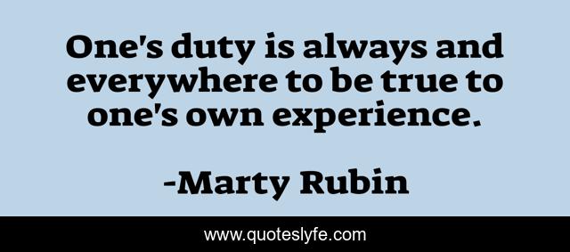 This page presents the quote "One's duty is always and everywhere to be true to one's own experience.". Author of this quote is Marty Rubin. This quote is about duty, experience, truth,.