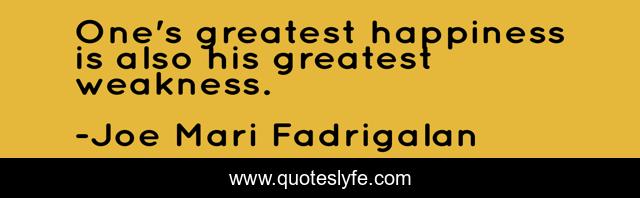 This page presents the quote "One's greatest happiness is also his greatest weakness.". Author of this quote is Joe Mari Fadrigalan. This quote is about weakness, life, happiness,.
