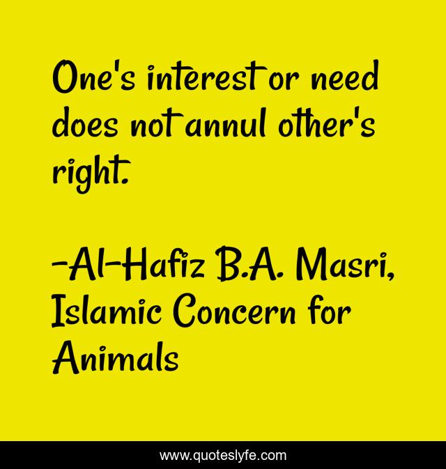 This page presents the quote "One's interest or need does not annul other's right.". Author of this quote is Al-Hafiz B.A. Masri, Islamic Concern for Animals. This quote is about animals, rights, animal-welfare, philosophy, animal-abuse, animal-rights, religion, rights-and-duties, ethics,.