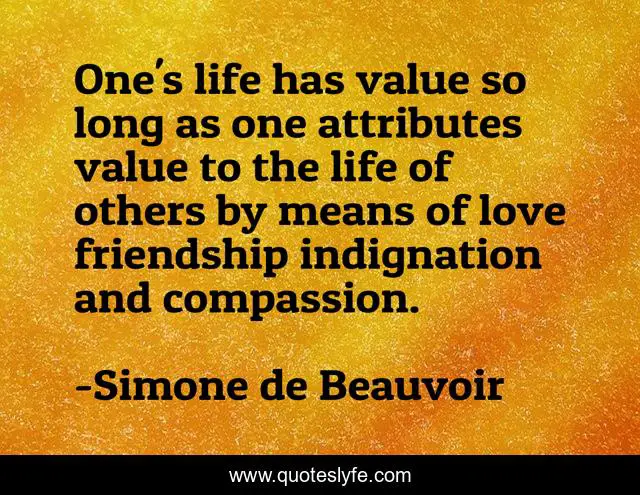 This page presents the quote "One's life has value so long as one attributes value to the life of others by means of love friendship indignation and compassion.". Author of this quote is Simone de Beauvoir. This quote is about helping, people,.