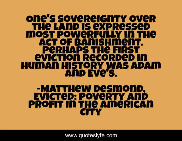 This page presents the quote "One's sovereignty over the land is expressed most powerfully in the act of banishment. Perhaps the first eviction recorded in human history was Adam and Eve's.". Author of this quote is Matthew Desmond, Evicted: Poverty and Profit in the American City. This quote is about banishment, eviction, poverty, power, homelessness,.