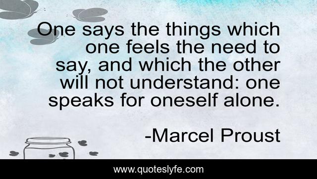 This page presents the quote "One says the things which one feels the need to say, and which the other will not understand: one speaks for oneself alone.". Author of this quote is Marcel Proust. This quote is about dialogue, love, interpersonal-communication, philosophy, wisdom, discourse, wit, affection,.
