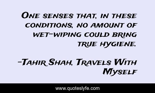 This page presents the quote "One senses that, in these conditions, no amount of wet-wiping could bring true hygiene.". Author of this quote is Tahir Shah, Travels With Myself. This quote is about hygiene, travel,.