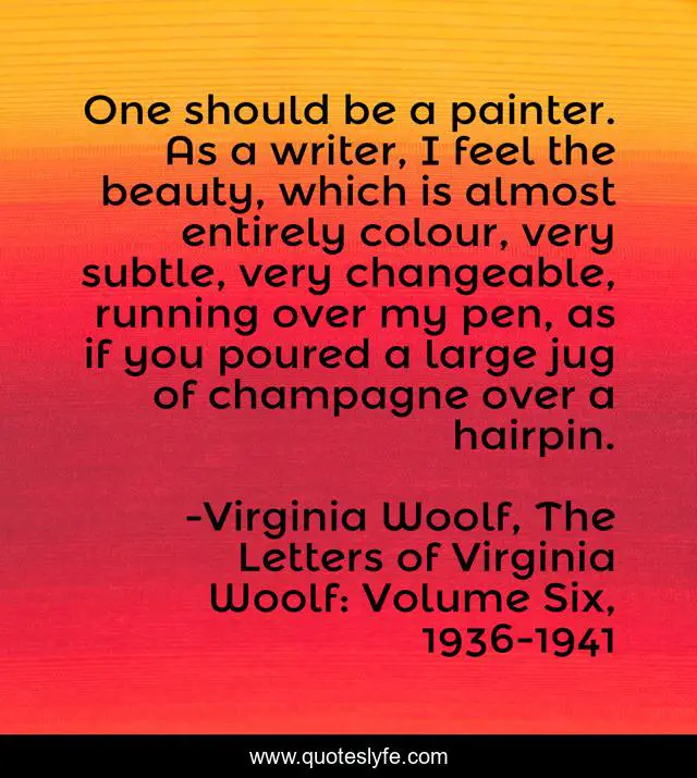 This page presents the quote "One should be a painter. As a writer, I feel the beauty, which is almost entirely colour, very subtle, very changeable, running over my pen, as if you poured a large jug of champagne over a hairpin.". Author of this quote is Virginia Woolf, The Letters of Virginia Woolf: Volume Six, 1936-1941. This quote is about colour, beauty, writing,.