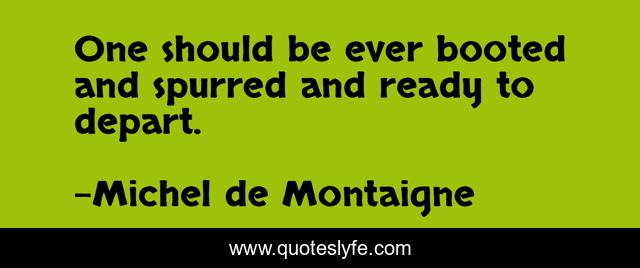 This page presents the quote "One should be ever booted and spurred and ready to depart.". Author of this quote is Michel de Montaigne. This quote is about death, dying,.