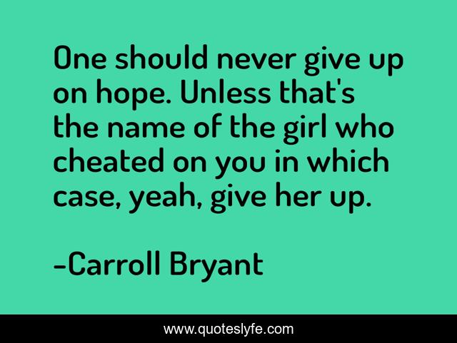 This page presents the quote "One should never give up on hope. Unless that's the name of the girl who cheated on you in which case, yeah, give her up.". Author of this quote is Carroll Bryant. This quote is about funny, humor, humorous, comedy-humor, funny-humor, relationship-humor, comedy, comical,.