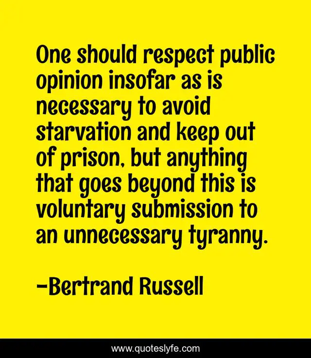 This page presents the quote "One should respect public opinion insofar as is necessary to avoid starvation and keep out of prison, but anything that goes beyond this is voluntary submission to an unnecessary tyranny.". Author of this quote is Bertrand Russell. This quote is about tyranny, opinion, prison,.