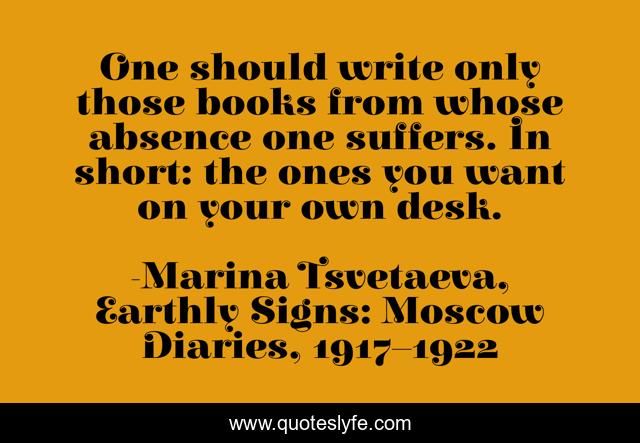 This page presents the quote "One should write only those books from whose absence one suffers. In short: the ones you want on your own desk.". Author of this quote is Marina Tsvetaeva, Earthly Signs: Moscow Diaries, 1917–1922. This quote is about russian, poetry, writing-advice,.