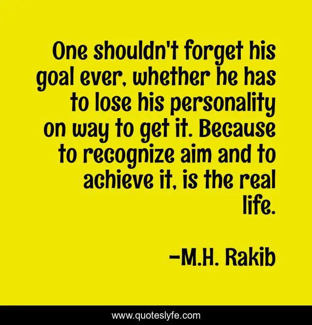 This page presents the quote "One shouldn't forget his goal ever, whether he has to lose his personality on way to get it. Because to recognize aim and to achieve it, is the real life.". Author of this quote is M.H. Rakib. This quote is about aim, self-realization, life, destination,.