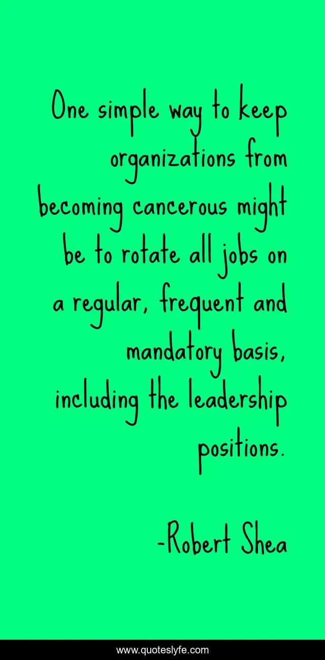 This page presents the quote "One simple way to keep organizations from becoming cancerous might be to rotate all jobs on a regular, frequent and mandatory basis, including the leadership positions.". Author of this quote is Robert Shea. This quote is about simple, jobs, way,.