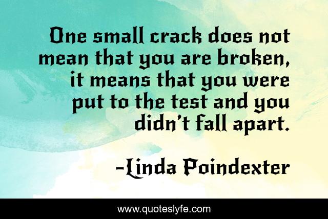 This page presents the quote "One small crack does not mean that you are broken, it means that you were put to the test and you didn’t fall apart.". Author of this quote is Linda Poindexter. This quote is about broken, fall-apart, inspirational, enthusiasm,.
