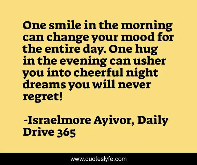 This page presents the quote "One smile in the morning can change your mood for the entire day. One hug in the evening can usher you into cheerful night dreams you will never regret!". Author of this quote is Israelmore Ayivor, Daily Drive 365. This quote is about beauty-of-smiles, cheerful, usher, laugh, keep-smiling, happiness, food-for-thought, mood, look-cheerful,.