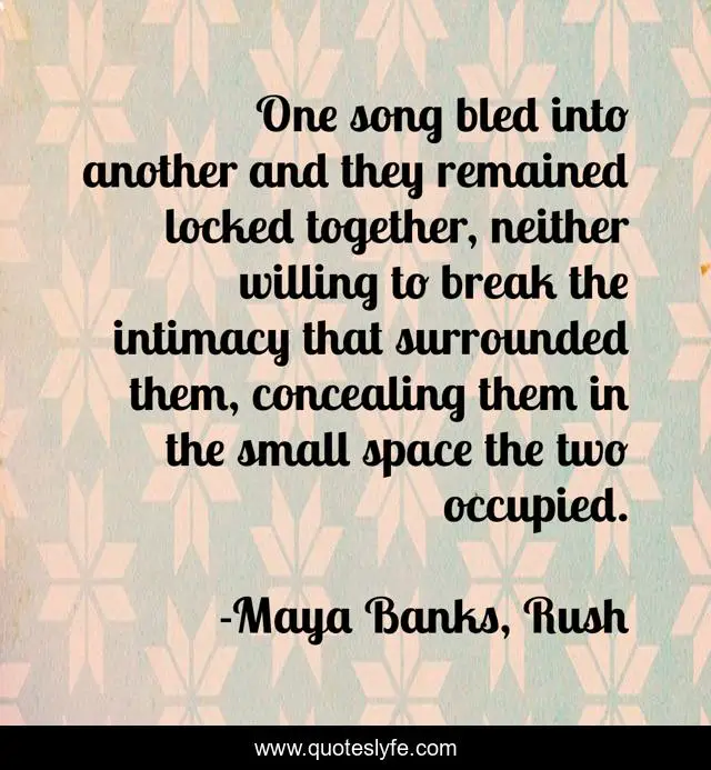 This page presents the quote "One song bled into another and they remained locked together, neither willing to break the intimacy that surrounded them, concealing them in the small space the two occupied.". Author of this quote is Maya Banks, Rush. This quote is about romance, erotic-romance, love, affection,.