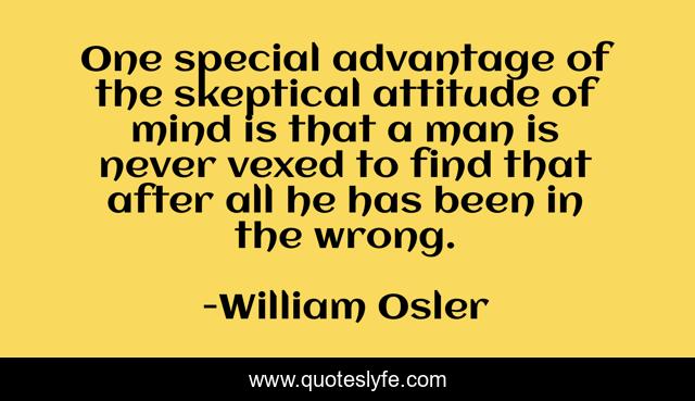 This page presents the quote "One special advantage of the skeptical attitude of mind is that a man is never vexed to find that after all he has been in the wrong.". Author of this quote is William Osler. This quote is about skepticism, truth,.
