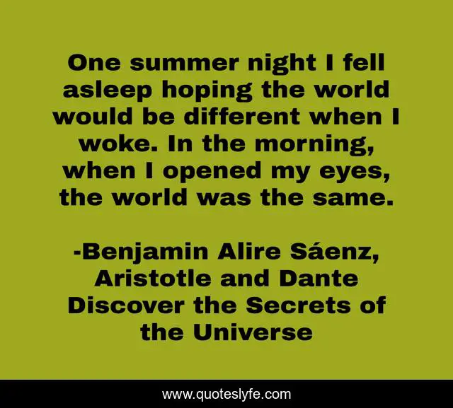 "Benjamin Alire Sáenz, Aristotle and Dante Discover the Secrets of the Universe Quotes." Quoteslyfe.com, 2025. Mon. 08 Dec. 2025. <https://www.quoteslyfe.com/quote/One-summer-night-I-fell-asleep-hoping-89102>.