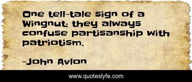This page presents the quote "One tell-tale sign of a Wingnut: they always confuse partisanship with patriotism.". Author of this quote is John Avlon. This quote is about partisanship, always, sign,.