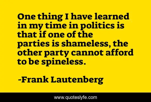 This page presents the quote "One thing I have learned in my time in politics is that if one of the parties is shameless, the other party cannot afford to be spineless.". Author of this quote is Frank Lautenberg. This quote is about party, i have learned, time,.