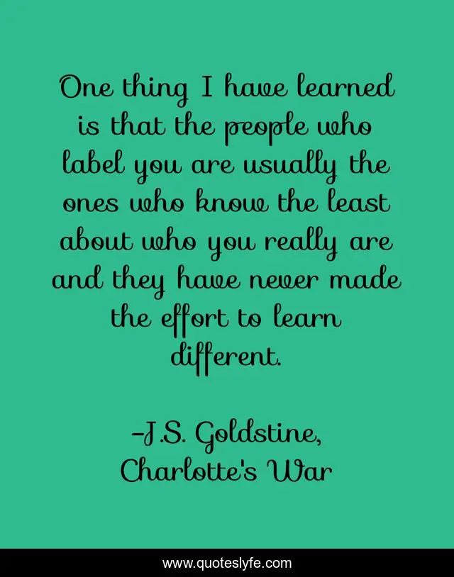 This page presents the quote "One thing I have learned is that the people who label you are usually the ones who know the least about who you really are and they have never made the effort to learn different.". Author of this quote is J.S. Goldstine, Charlotte's War. This quote is about judgement, quote, life, label, people,.