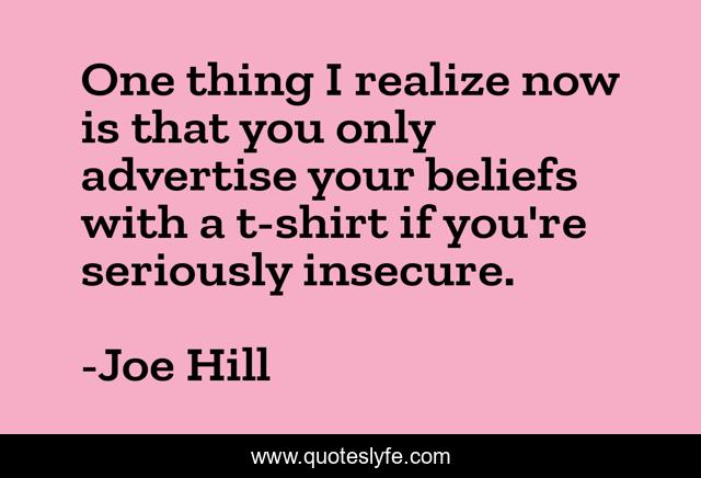 This page presents the quote "One thing I realize now is that you only advertise your beliefs with a t-shirt if you're seriously insecure.". Author of this quote is Joe Hill. This quote is about tshirts, insecurity, insecurities, beliefs,.