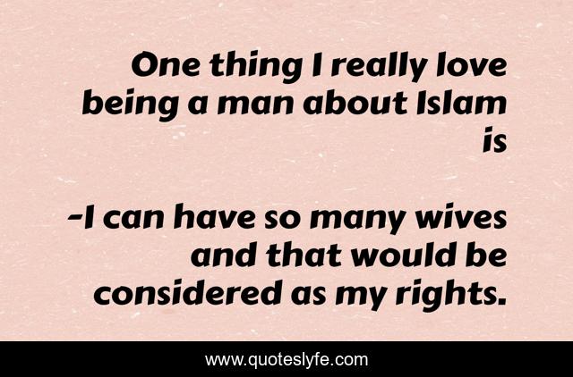 This page presents the quote "One thing I really love being a man about Islam is". Author of this quote is I can have so many wives and that would be considered as my rights.. .