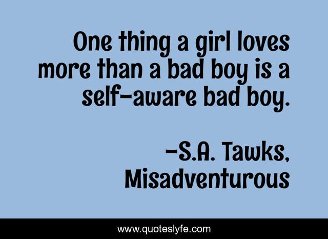 This page presents the quote "One thing a girl loves more than a bad boy is a self-aware bad boy.". Author of this quote is S.A. Tawks, Misadventurous. This quote is about queensland, australia, adventure, adventurous, bad-boys,.