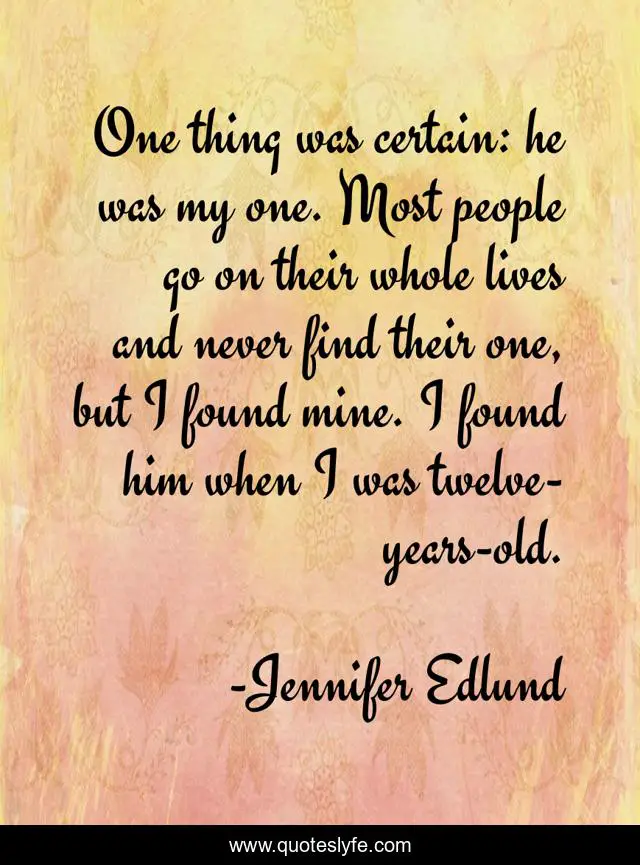 This page presents the quote "One thing was certain: he was my one. Most people go on their whole lives and never find their one, but I found mine. I found him when I was twelve-years-old.". Author of this quote is Jennifer Edlund. This quote is about love, fiction-novel, friendship-and-love, love-story, young-lovers, affection,.