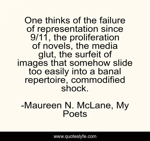 This page presents the quote "One thinks of the failure of representation since 9/11, the proliferation of novels, the media glut, the surfeit of images that somehow slide too easily into a banal repertoire, commodified shock.". Author of this quote is Maureen N. McLane, My Poets. This quote is about failure, 9-11, surfeit, representation,.