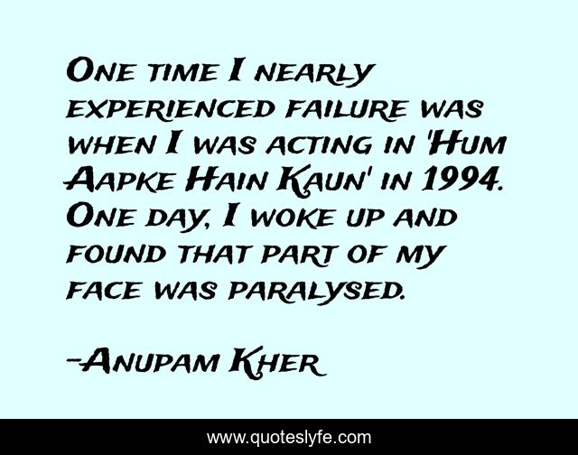 This page presents the quote "One time I nearly experienced failure was when I was acting in 'Hum Aapke Hain Kaun' in 1994. One day, I woke up and found that part of my face was paralysed.". Author of this quote is Anupam Kher. This quote is about acting, day, time,.