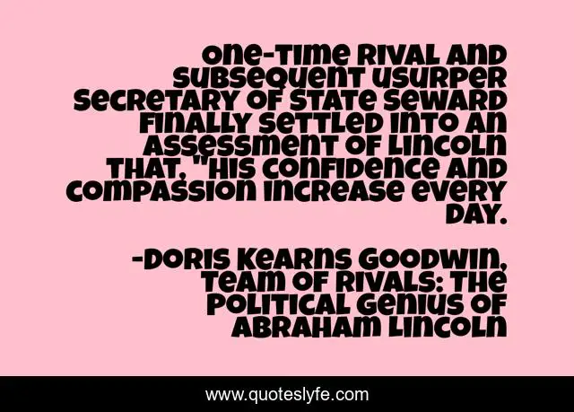 This page presents the quote "One-time rival and subsequent usurper Secretary of State Seward finally settled into an assessment of Lincoln that, "His confidence and compassion increase every day.". Author of this quote is Doris Kearns Goodwin, Team of Rivals: The Political Genius of Abraham Lincoln. This quote is about compassion, confidence, empathy, leadership, personal-growth,.