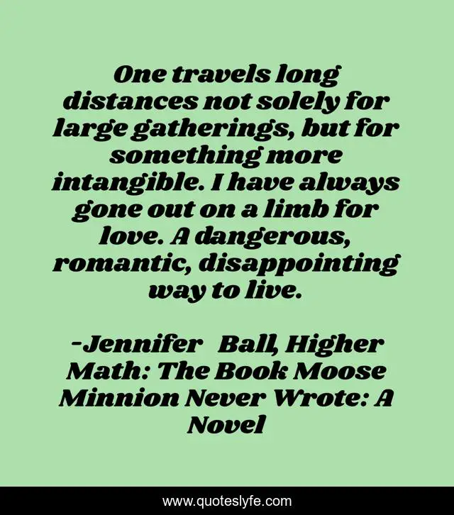 This page presents the quote "One travels long distances not solely for large gatherings, but for something more intangible. I have always gone out on a limb for love. A dangerous, romantic, disappointing way to live.". Author of this quote is Jennifer Ball, Higher Math: The Book Moose Minnion Never Wrote: A Novel. This quote is about travel, love, affection,.