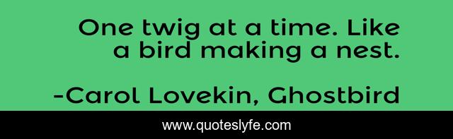 This page presents the quote "One twig at a time. Like a bird making a nest.". Author of this quote is Carol Lovekin, Ghostbird. This quote is about life, positive, motivational, confidence, optimistic, birds,.