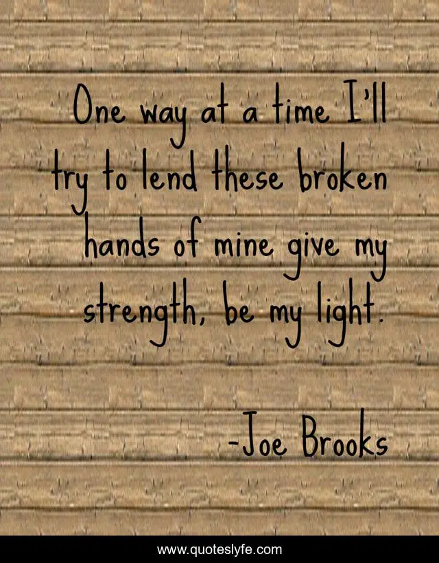 This page presents the quote "One way at a time I'll try to lend these broken hands of mine give my strength, be my light.". Author of this quote is Joe Brooks. This quote is about life, broken, light, strenght, fight, difficulty, grey-s-anatomy, these-broken-hands-of-mine, hope,.